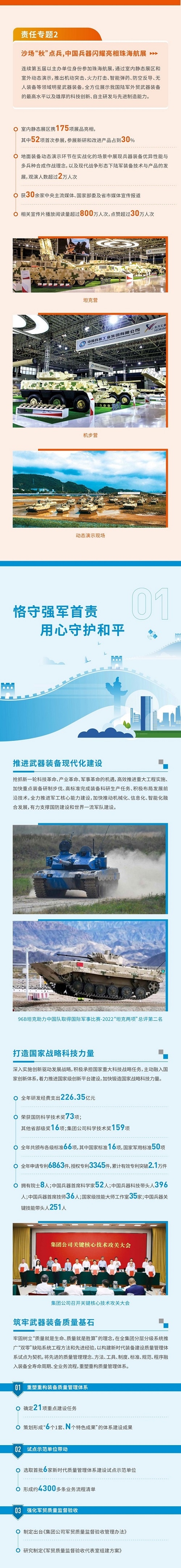 《報(bào)告》開篇設(shè)置“突出政治引領(lǐng),全面加強(qiáng)黨的領(lǐng)導(dǎo)黨的建設(shè)”“沙場(chǎng)‘秋’點(diǎn)兵,中國兵器閃耀亮相珠海航展”兩個(gè)責(zé)任專題,聚焦集團(tuán)公司加強(qiáng)黨建、強(qiáng)軍報(bào)國的擔(dān)當(dāng)作為,書寫集團(tuán)公司在新時(shí)代新征程上的奮進(jìn)答卷。主體章節(jié)以“用心守護(hù)和平、用力爭創(chuàng)一流、用情溫暖社會(huì)”為主題,從恪守強(qiáng)軍首責(zé)、服務(wù)經(jīng)濟(jì)建設(shè)、共創(chuàng)美好生活三個(gè)維度展現(xiàn)了集團(tuán)公司立足“1+5”戰(zhàn)略和“雙十”規(guī)劃,聚焦新時(shí)代新征程新任務(wù)高質(zhì)量履行政治責(zé)任、經(jīng)濟(jì)責(zé)任和社會(huì)責(zé)任的具體行動(dòng)和成效亮點(diǎn),詮釋了集團(tuán)公司服務(wù)國家戰(zhàn)略、服務(wù)國防和軍隊(duì)現(xiàn)代化建設(shè)、服務(wù)國家經(jīng)濟(jì)社會(huì)發(fā)展的職責(zé)使命。